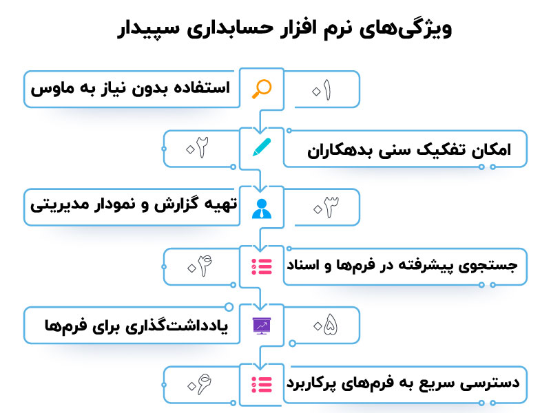 یکی از دلایل محبوبیت سپیدار در میان حسابداران، وجود امکانات گسترده و کاربردی آن است. از مهمترین ویژگیهای این نرمافزار میتوان به موارد زیر اشاره کرد :
