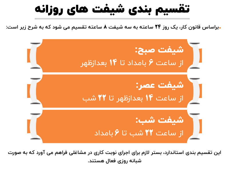 بر اساس قانون کار، یک روز 24 ساعته به سه شیفت 8 ساعته تقسیم میشود که به شرح زیر است :