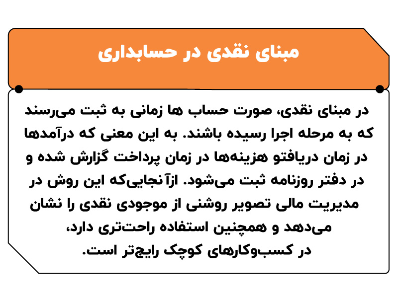 در مبنای نقدی، صورت حساب ها زمانی به ثبت میرسند که به مرحله اجرا رسیده باشند. به این معنی که درآمدها در زمان دریافت و هزینهها در زمان پرداخت گزارش شده و در دفتر روزنامه ثبت میشود. ازآنجاییکه این روش در مدیریت مالی تصویر روشنی از موجودی نقدی را نشان میدهد و همچنین استفاده راحتتری دارد، در کسبوکارهای کوچک رایجتر است.