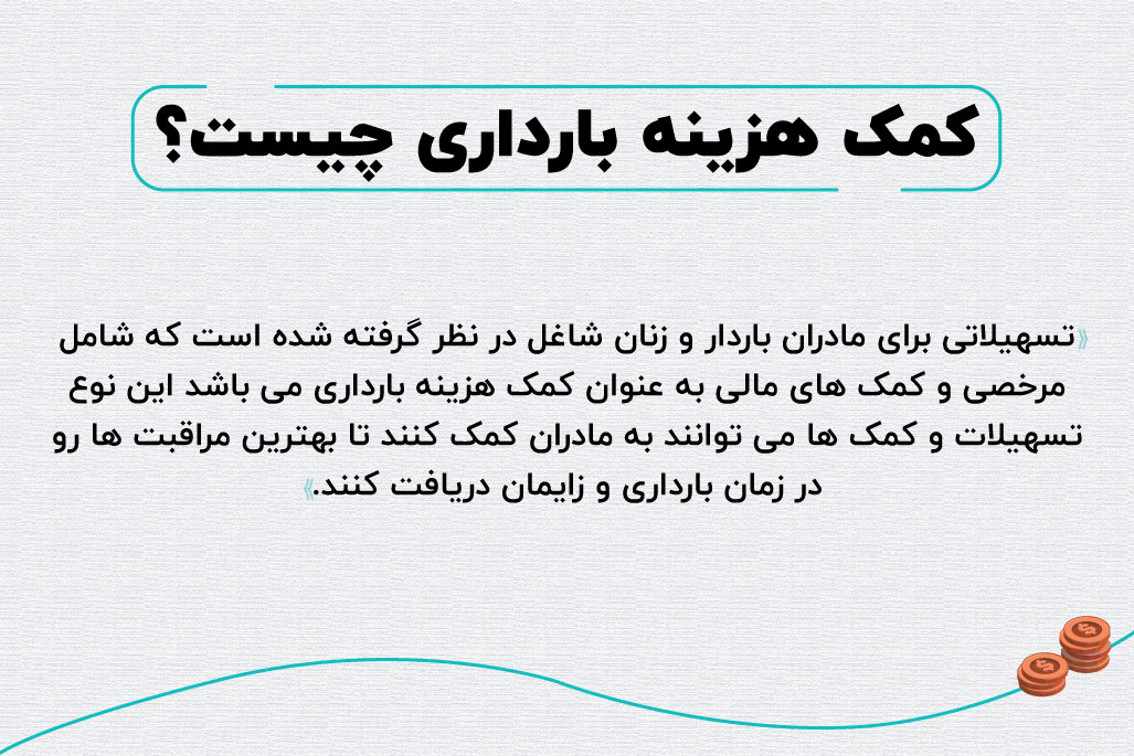 تسهیلاتی برای مادران باردار و زنان شاغل در نظر گرفته شده است که شامل مرخصی و کمک های مالی به عنوان کمک هزینه بارداری می باشد این نوع تسهیلات و کمک ها می توانند به مادران کمک کنند تا بهترین مراقبت ها رو در زمان بارداری و زایمان دریافت کنند و از دغدغه های مالی و ذهنی کمتر رنج ببرند این اقدامات اهمیت زیادی در افزایش رضایت و سلامتی مادران و نوزادان دارند این تسهیلات شامل موارد زیر می باشند :