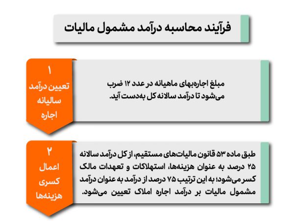 ابتدا اجارهبهای ماهیانه ضرب در ۱۲ و افزودن درصدی از پول پیش (در صورت وجود) انجام میشود؛ سپس با کسر ۲۵ درصد هزینهها، مبلغ ۷۵ درصد باقیمانده به عنوان درآمد مشمول مالیات تعیین و طبق جدول نرخهای تصاعدی (۱۵٪، ۲۰٪، ۲۵٪) محاسبه میگردد.
