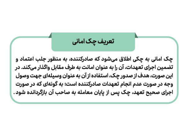 چک امانت سندی است که برای تضمین اجرای تعهدات صادر میشود و تا انجام کامل تعهد نزد طرف مقابل میماند؛ هدف از آن پرداخت در تاریخ معین نیست و اصولاً بهعنوان وثیقه یا ضمانت در قراردادها استفاده میشود.